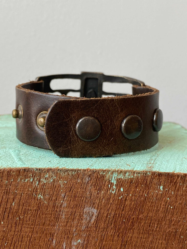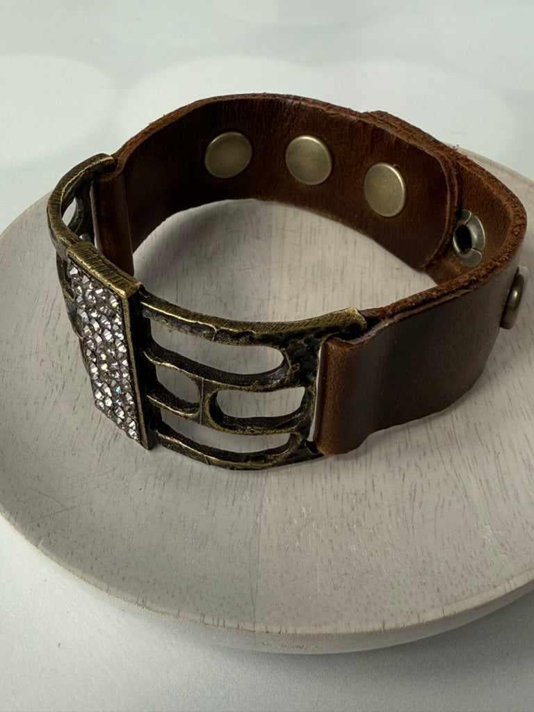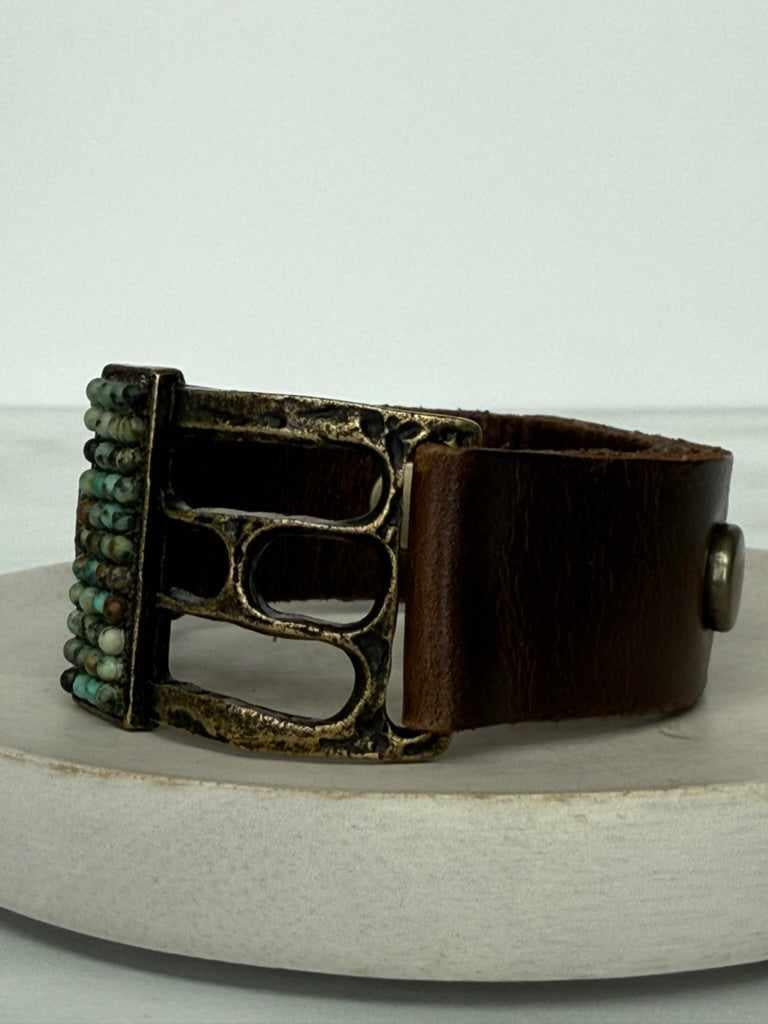 Lexis Bracelet $105.00 stone black diamond black diamond African Turquoise black diamond African Turquoise An open brass rectangle with 4 rows of vertical stones on a vintage brown leather band. 7/8" wide leather band fits 6 1/4" - 8 1/4" wrist. The snap closure has three options for a perfect fit. Bracelet is handmade in NYC. Add to Cart Notify Me When Available