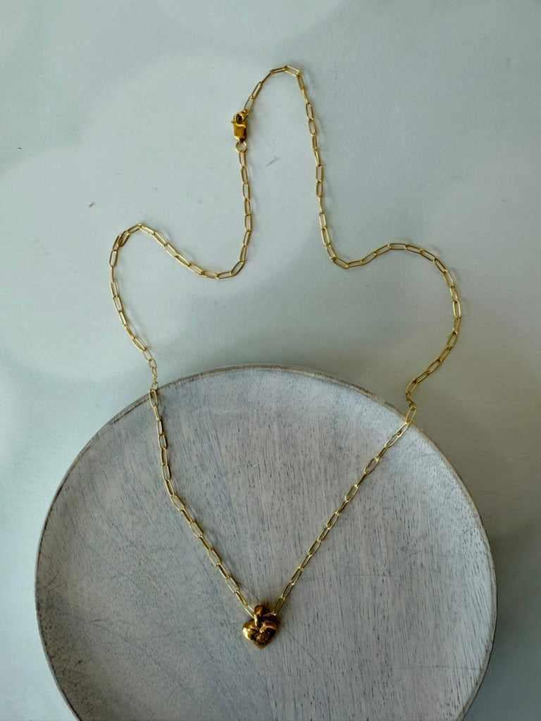 Amor Necklace $58.00 Default Title Perfect for your sweetheart. A 24K heavy deposition gold plated textured heart shaped piece hangs from an 18" 14K gold filled paperclip chain. Necklace handmade in MT Add to Cart Notify Me When Available