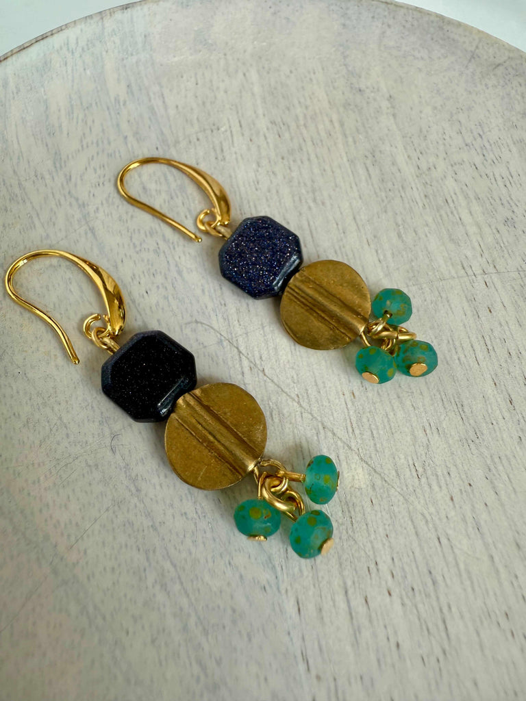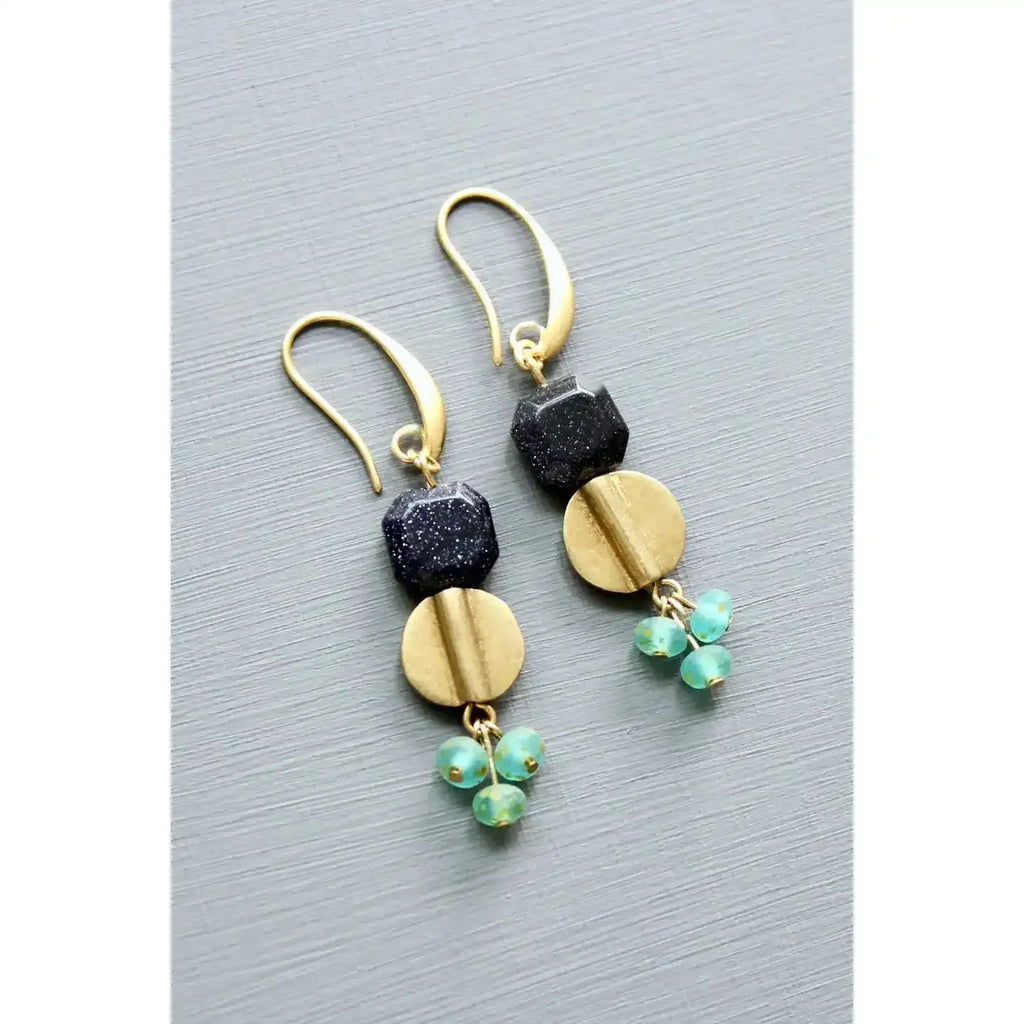 Blue Goldstone and Aqua Earrings $48.00 Default Title We are obsessed with these beauties! Gold plated brass hook earrings with blue goldstone and aqua glass. Each earring measures 2.25" Earrings are handmade in NJ. Add to Cart Notify Me When Available