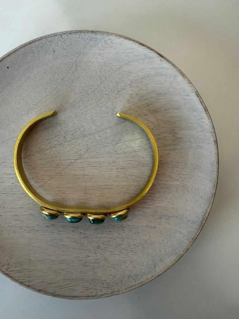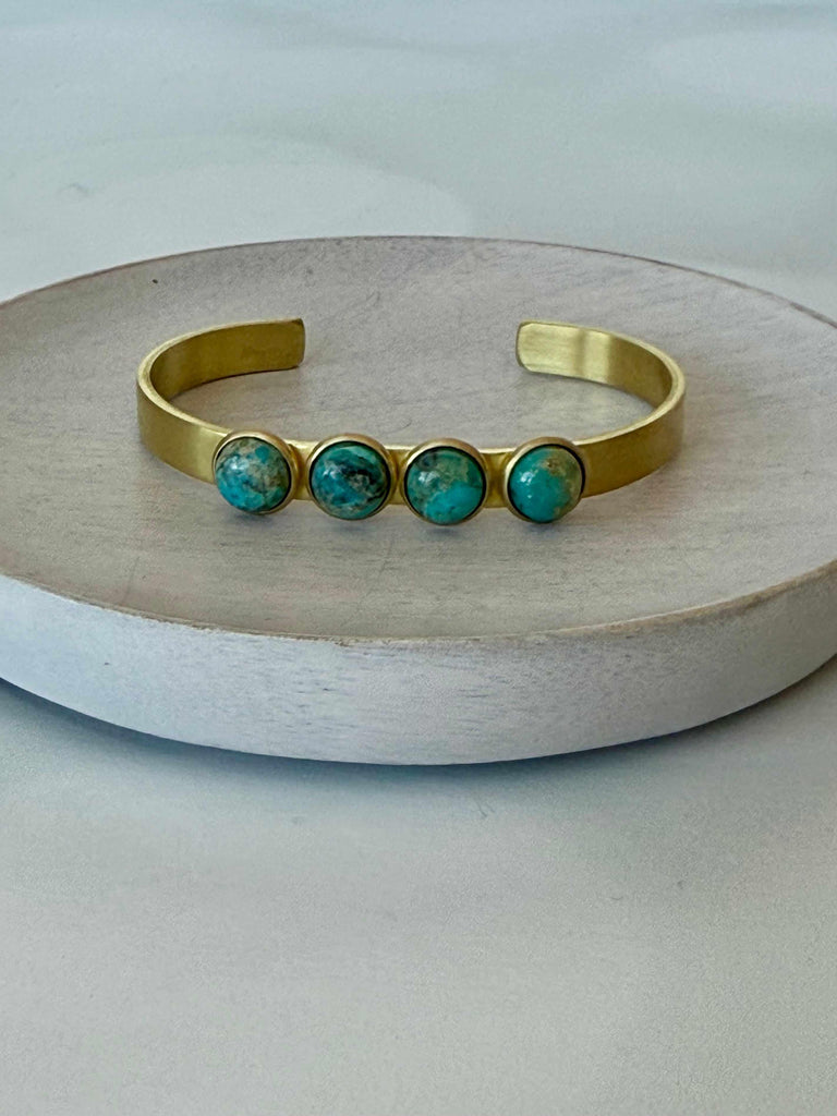Bridger Cuff $82.00 Default Title Solid brass cuff with 4, 8mm turquoise stones. Dainty and perfect for everyday. Bracelet is handmade in MT Add to Cart Notify Me When Available