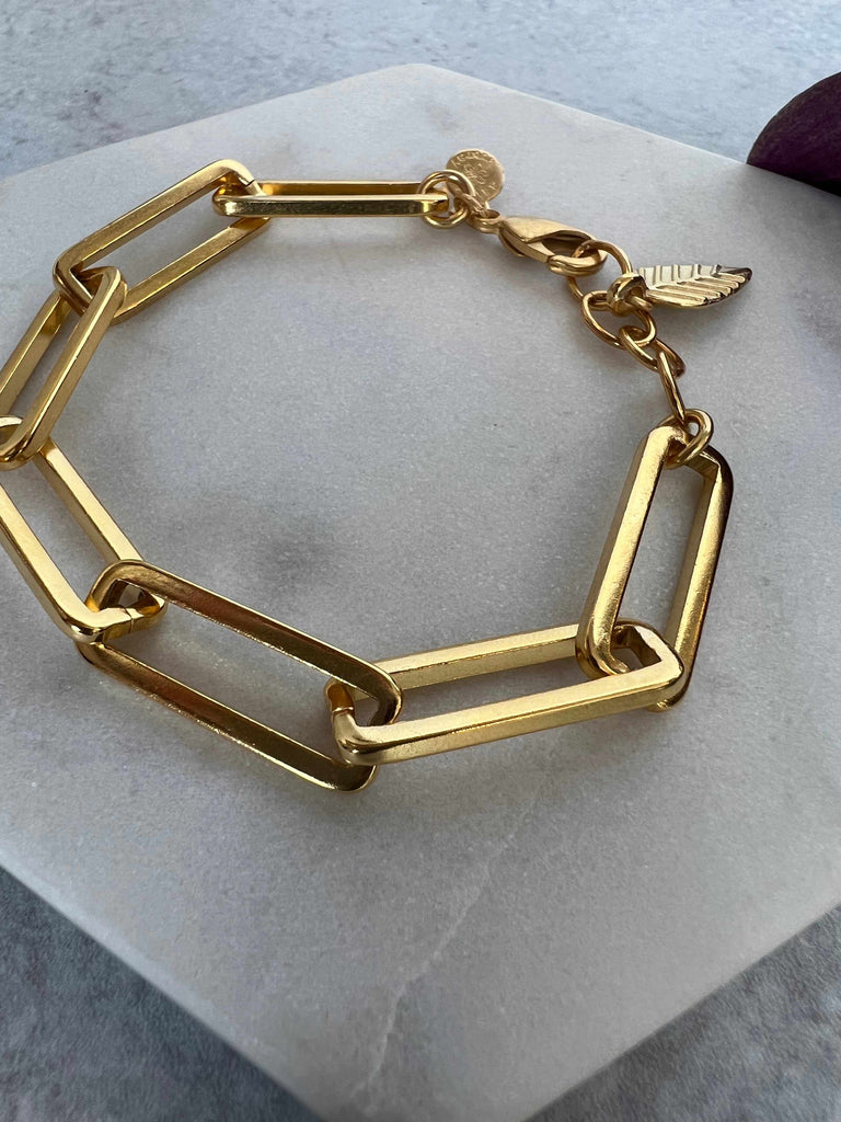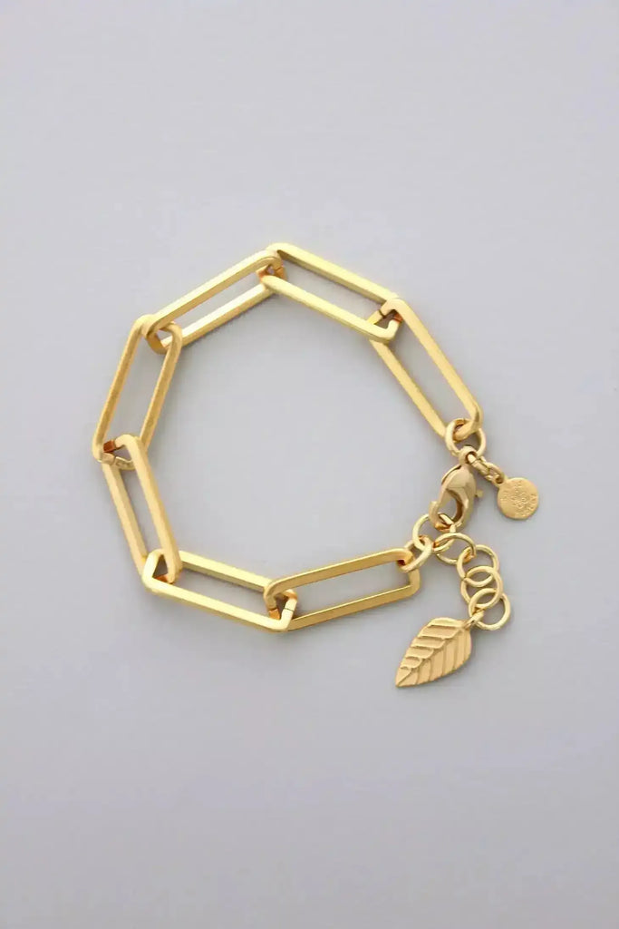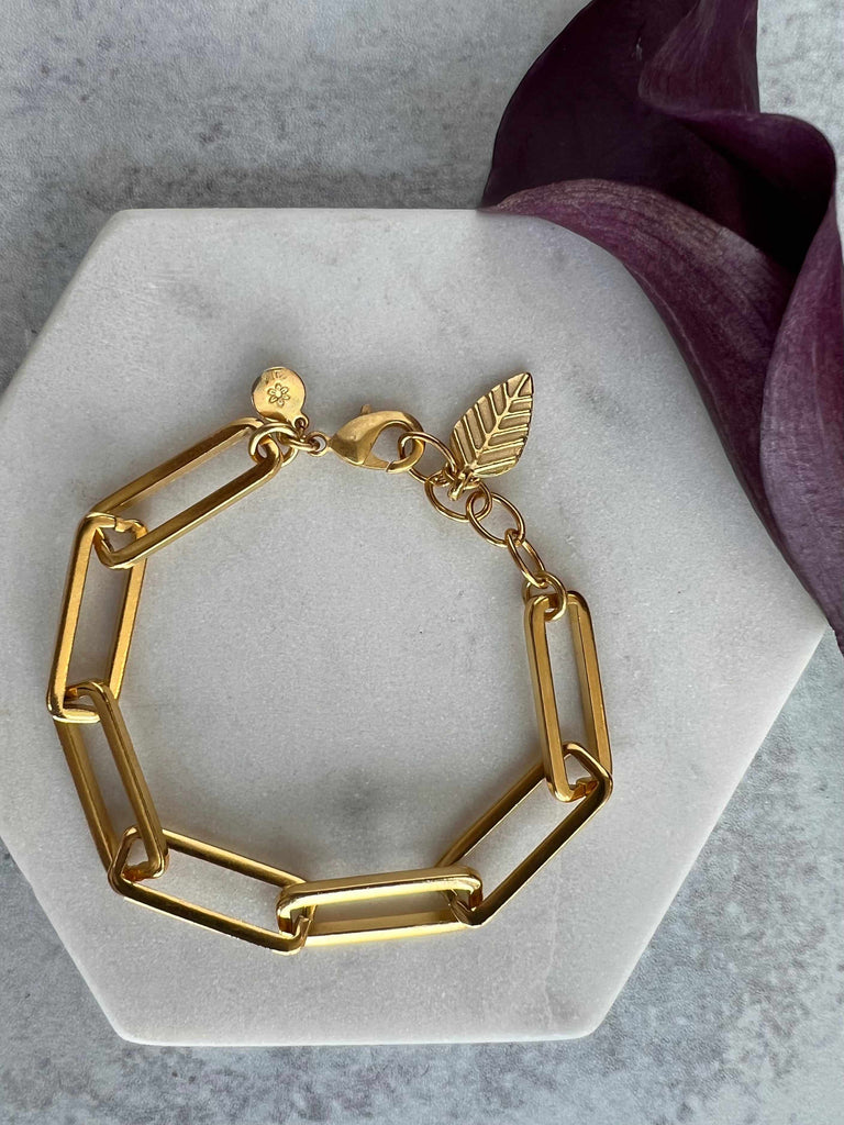 This stylish Gold Paperclip Chain Bracelet is perfect for adding a touch of minimalistic flair to any outfit. Perfect for day-to-day wear this fashion-forward statement piece is sure to be coveted!