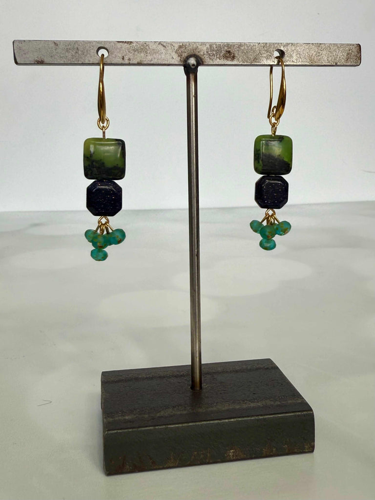 Green Jasper and Blue Goldstone Earrings $48.00 Default Title Gold plated brass hook earrings with green jasper, sparkly blue goldstone, and aqua glass. Each earring measures 2.75" Earrings are handmade in NJ. Add to Cart Notify Me When Available