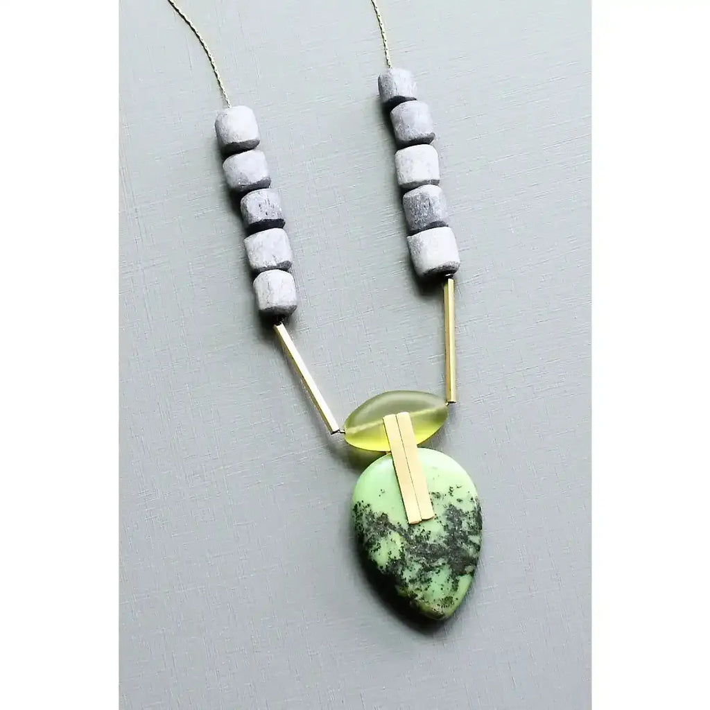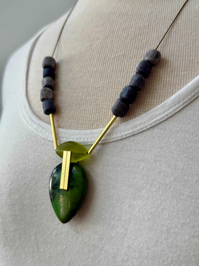 Green Jasper and Glass Necklace $64.00 Default Title Beautiful statement necklace with an oxidized brass chain, green glass, and green jasper. 24" necklace with 1" extender Necklace is handmade in NJ Add to Cart Notify Me When Available