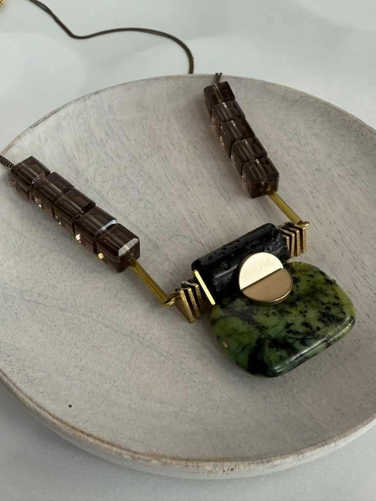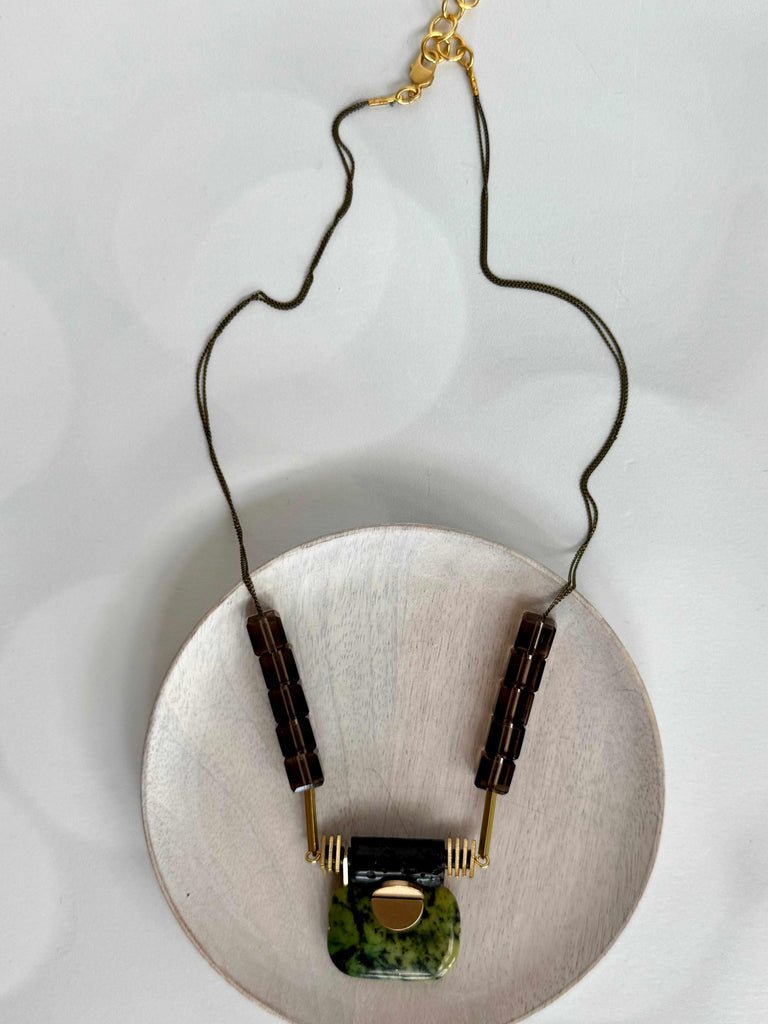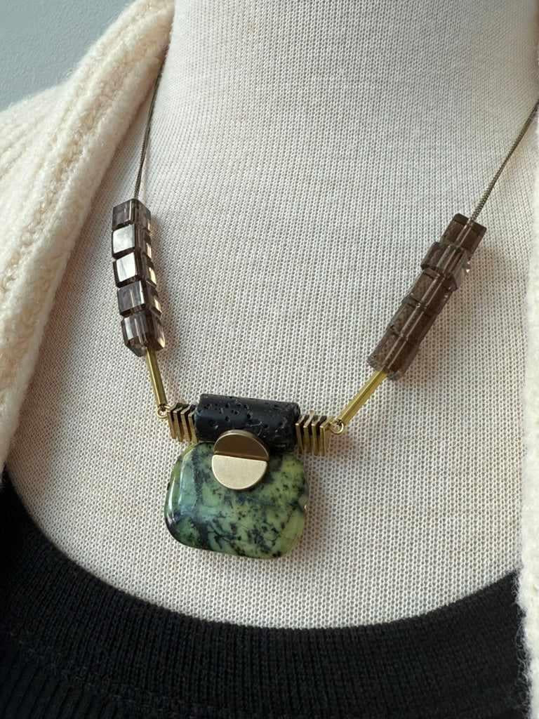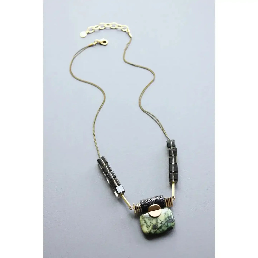 Green Jasper and Lava Pendant Necklace $72.00 Default Title Art Deco inspired green jasper and lava stone necklace has sparkling glass beads that adorn the oxidized brass chain. 19" necklace with 2" extender Necklace is handmade in NJ Add to Cart Notify Me When Available