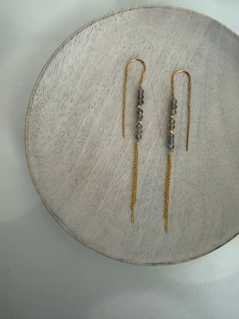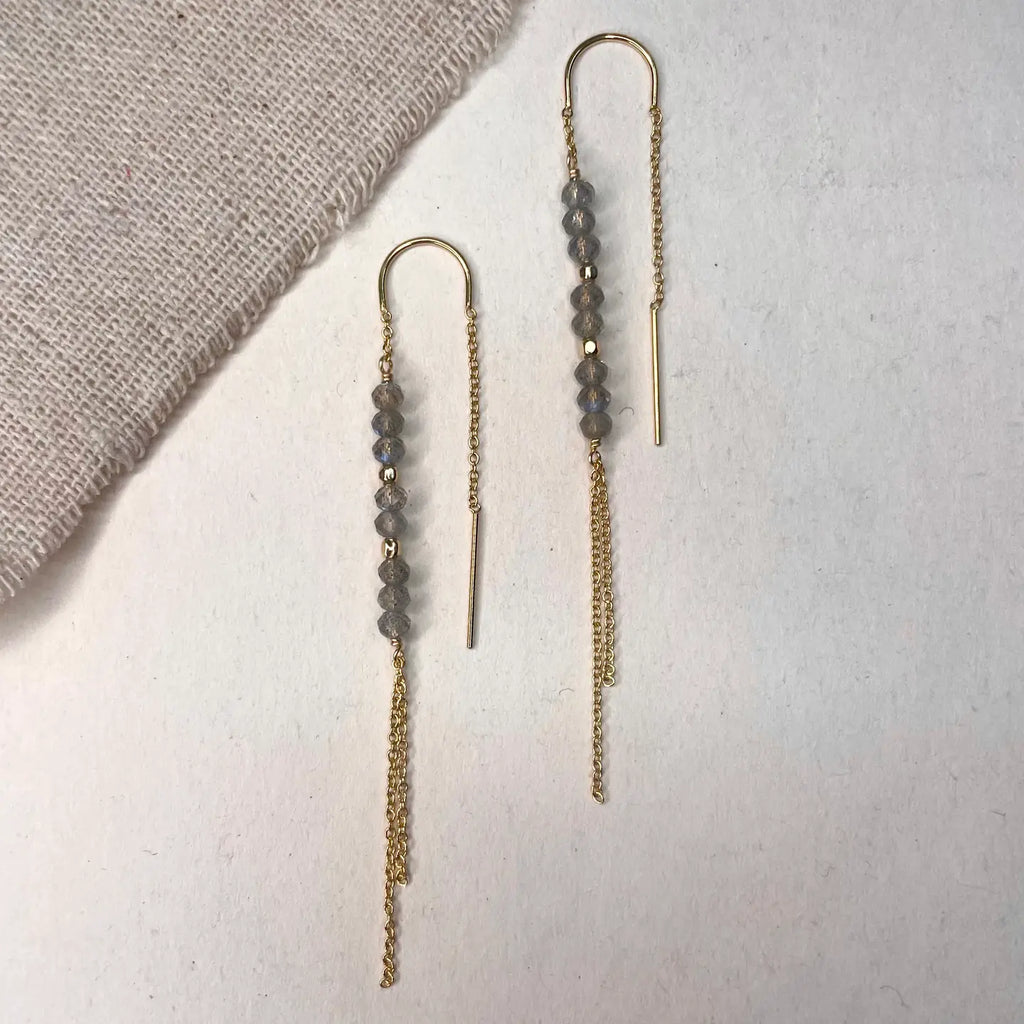 Labradorite Threader Earrings $48.00 Default Title These earrings thread through your ear to have a delicate chain hanging in the back. 14k gold fill chain with petite labradorite gemstones Waterproof and sweat-proof Hypoallergenic, lead and nickel free Threaders are handmade in Portland, Oregon. Add to Cart Notify Me When Available