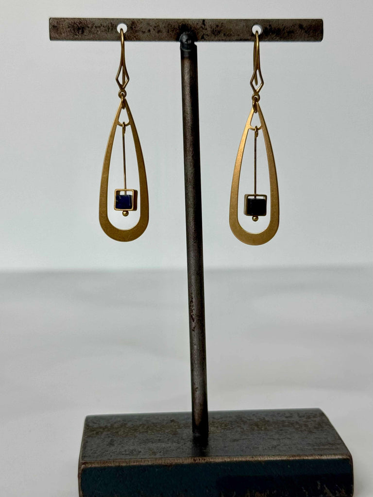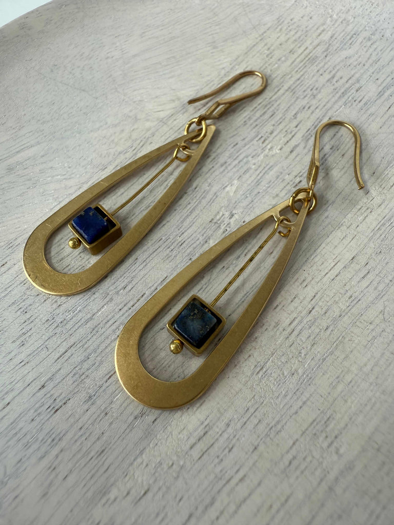 Add a splash of color and charm with these playful brass teardrop earrings featuring a vibrant lapis stone dangling in the center. Measuring about 1.5" long, each pair offers a unique touch as stone colors may vary, making your look truly one-of-a-kind.