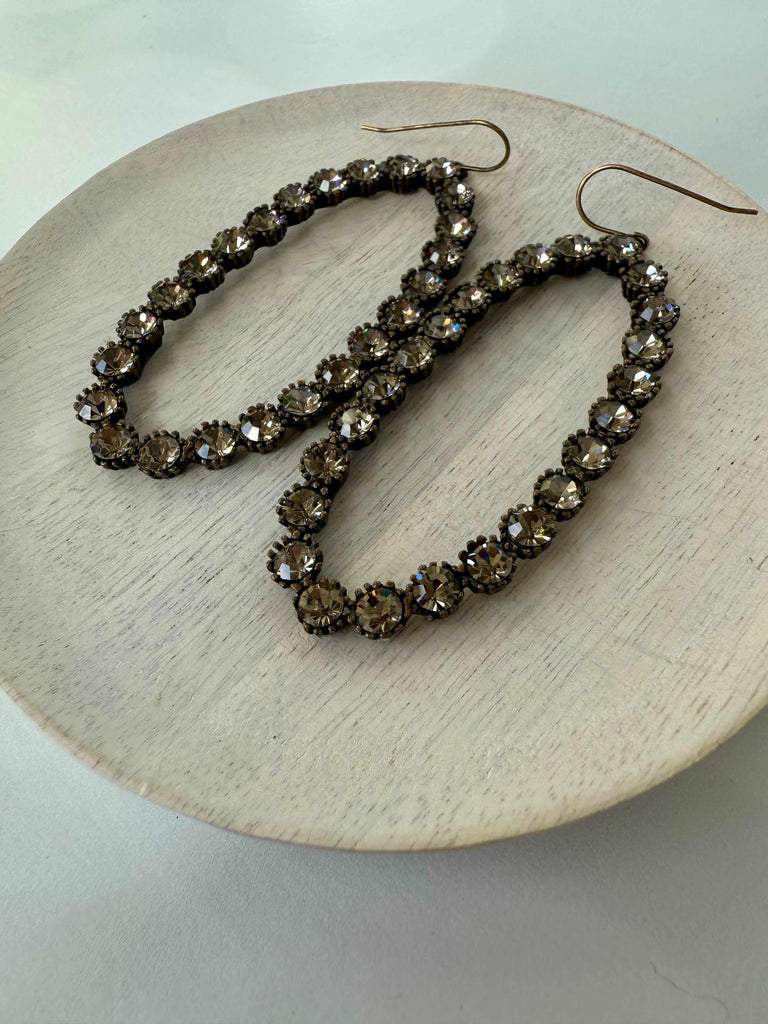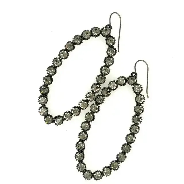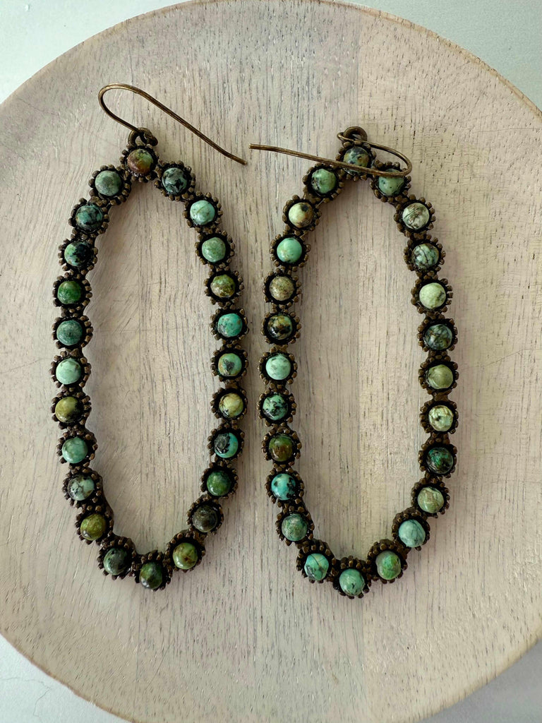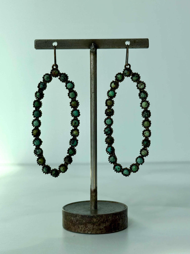 Large Open Oval Hoop Earrings $80.00 stone African Turquoise African Turquoise Black Diamond African Turquoise Black Diamond Large open oval hoop earrings. Antique brass finish with semi-precious stones or Austrian crystals. 3" x 1.25" Earrings are handmade in NYC. Add to Cart Notify Me When Available
