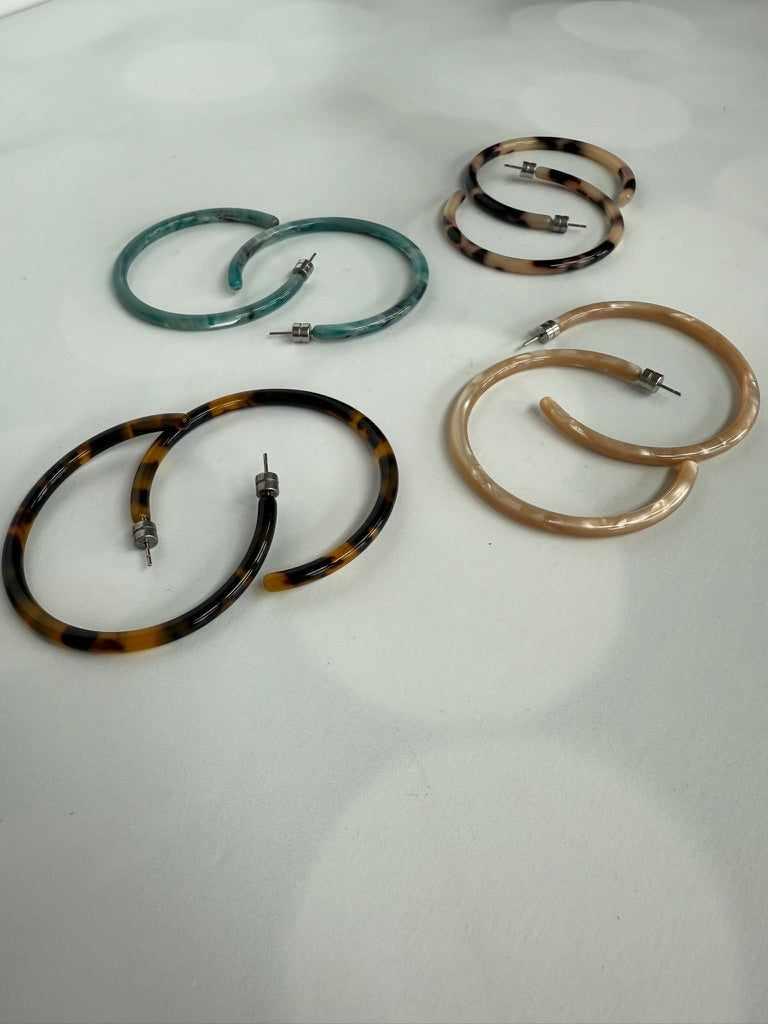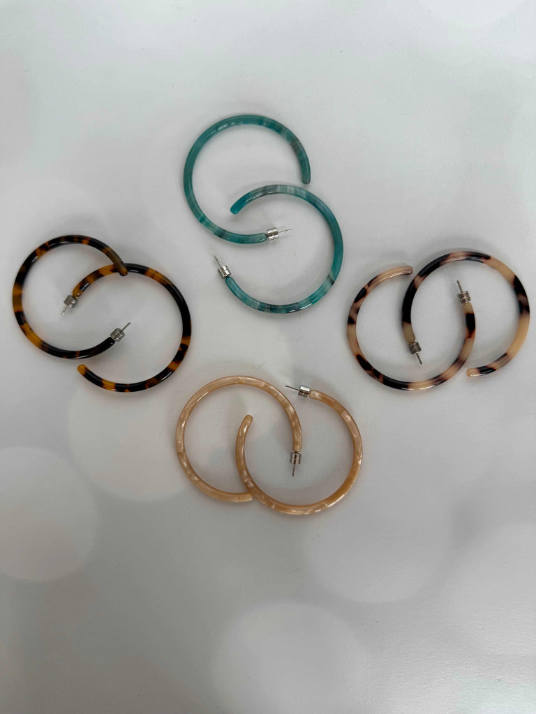 These light as a feather hoops measure 2.25” diameter, and are crafted from high quality non-petroleum based Italian acetate with a stainless steel, hypoallergenic post.