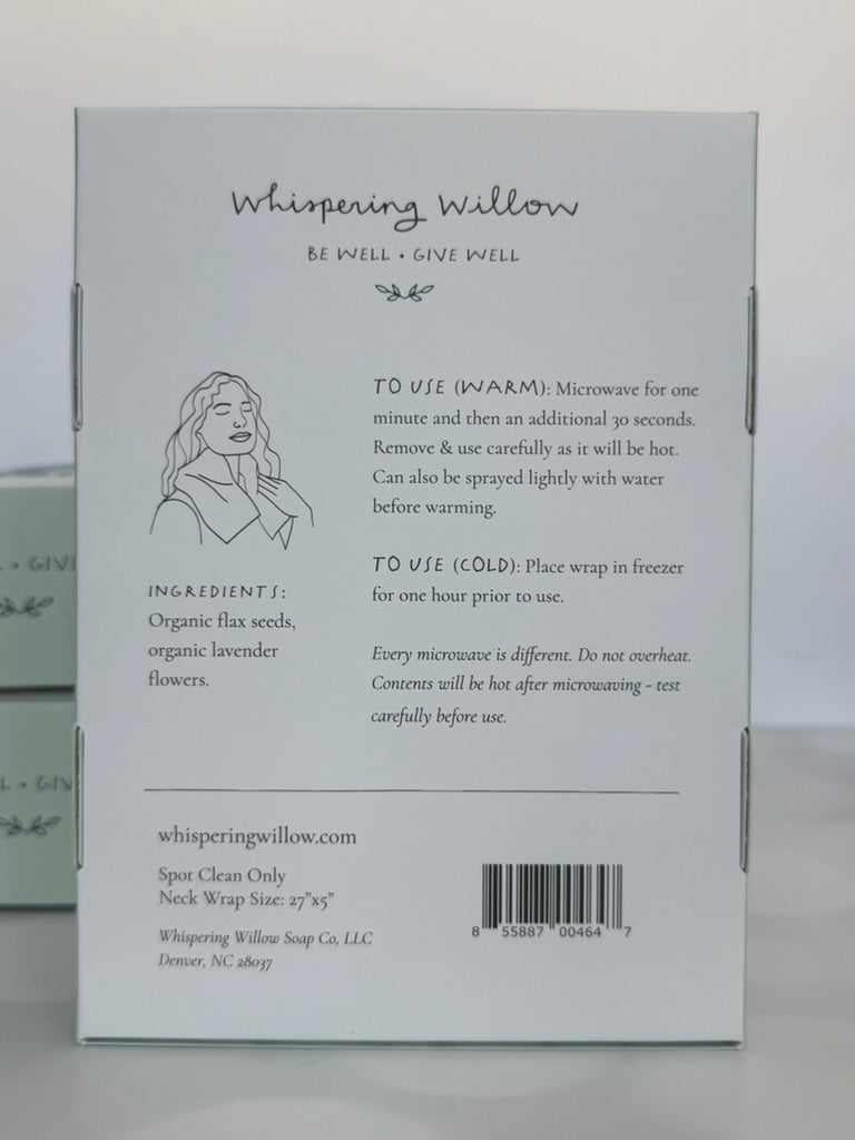 Take a deep breath, relax, and exhale the worries of the day as the calming scent of lavender envelopes you. Release the tension and tightness in your muscles as the warmth settles into your neck and shoulders. Let the soft cotton flannel introduce a gentleness to your skin as the weight of the flax and lavender filled neck wrap helps to ground you in this moment.