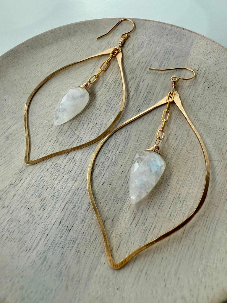These earrings feature a hand hammered petal shape, with a rainbow moonstone spade delicately hanging by a section of light catching chain.