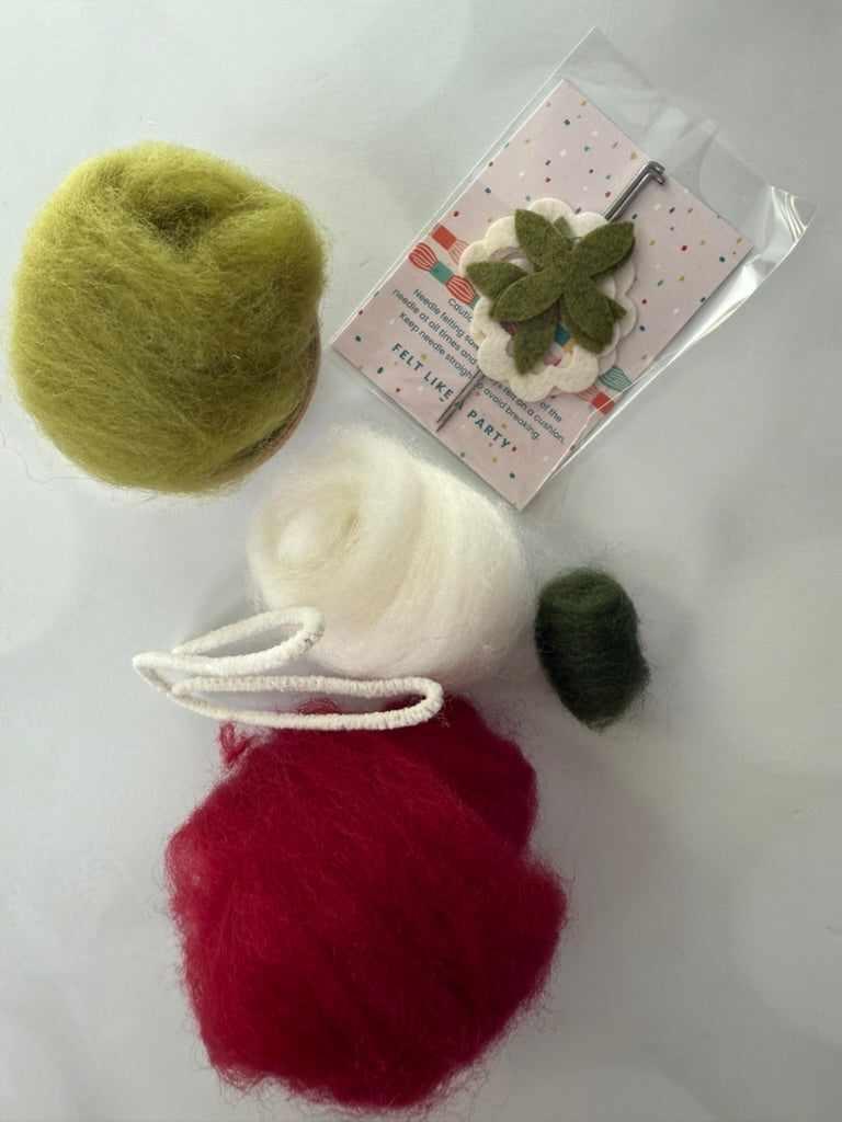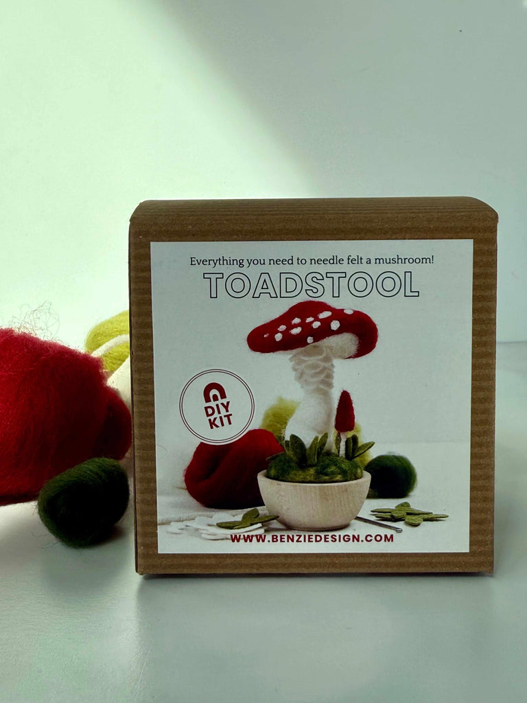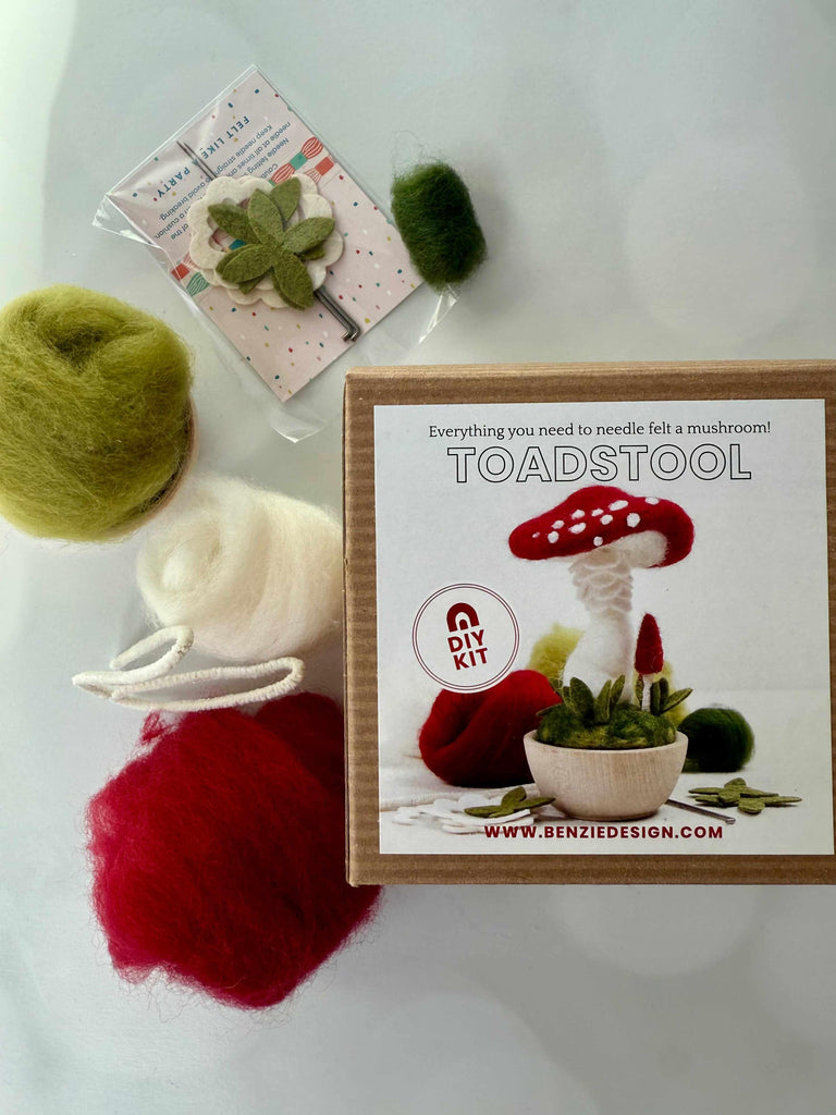 Modeled after the Fly Agaric mushroom, the Crimson Toadstool needle felting kit includes all the supplies to make your own mushroom: felting needle, foam cushion, roving, cotton stems, felt accents and a wood turned bowl.