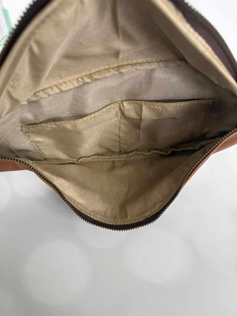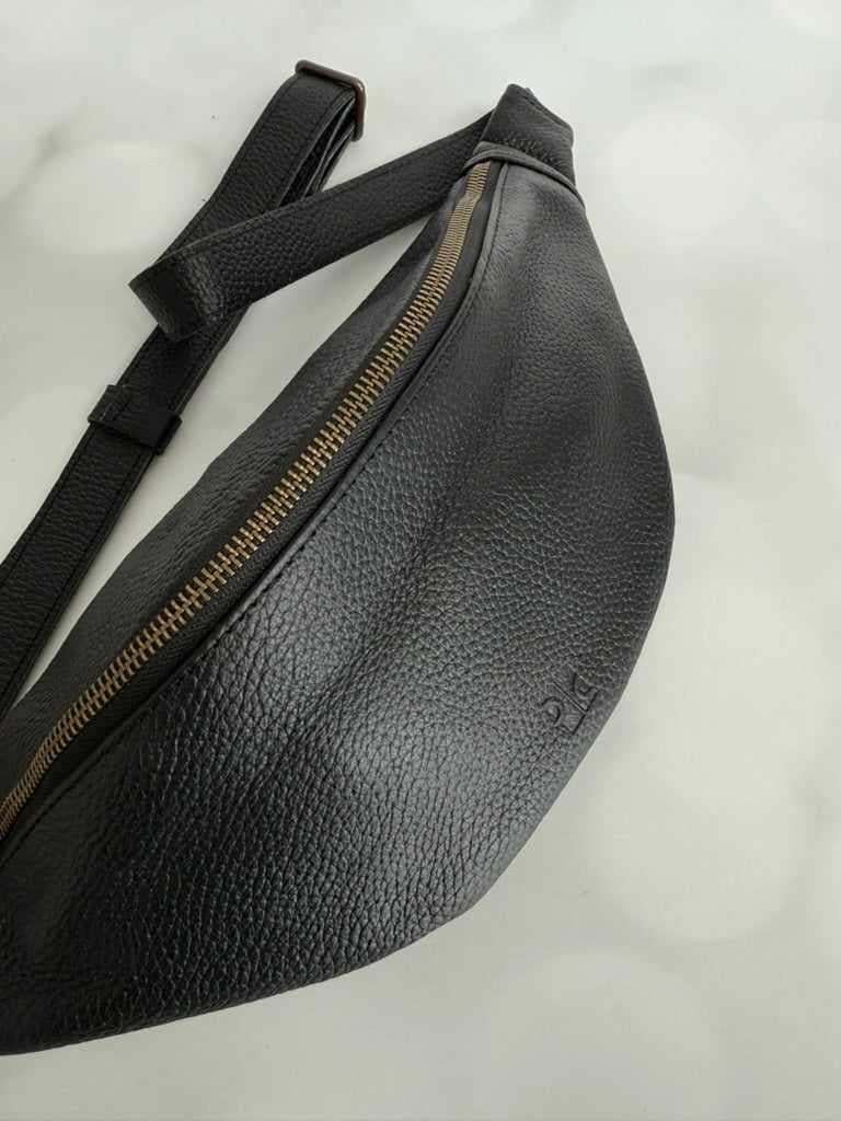 Features: Fully lined with two interior slip pockets, Antique brass zipper closure for secure storage, Adjustable strap to be worn as a sling bag or a belt bag / fanny pack.