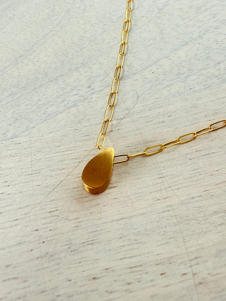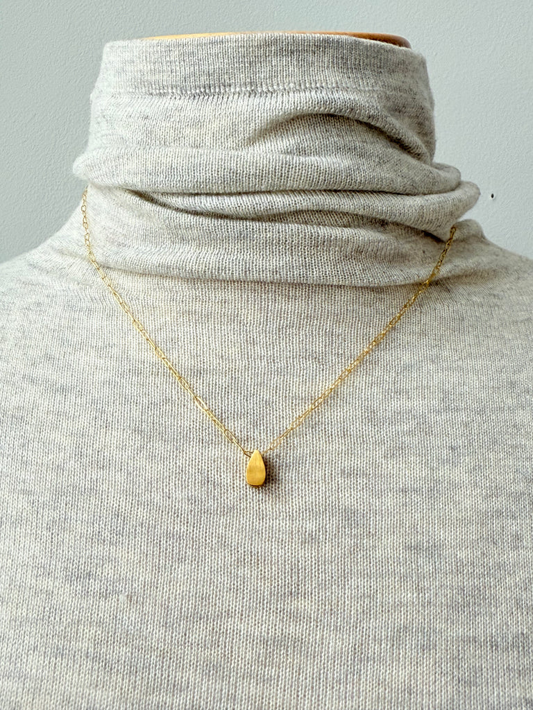 Rain Necklace $58.00 Default Title We will be wearing this sweet, dainty necklace on repeat! A 24K heavy deposition gold plated 10mm x 5mm drop shaped piece hangs from an 18" 14K/20 gold filled paperclip chain. Necklace is handmade in MT. Add to Cart Notify Me When Available