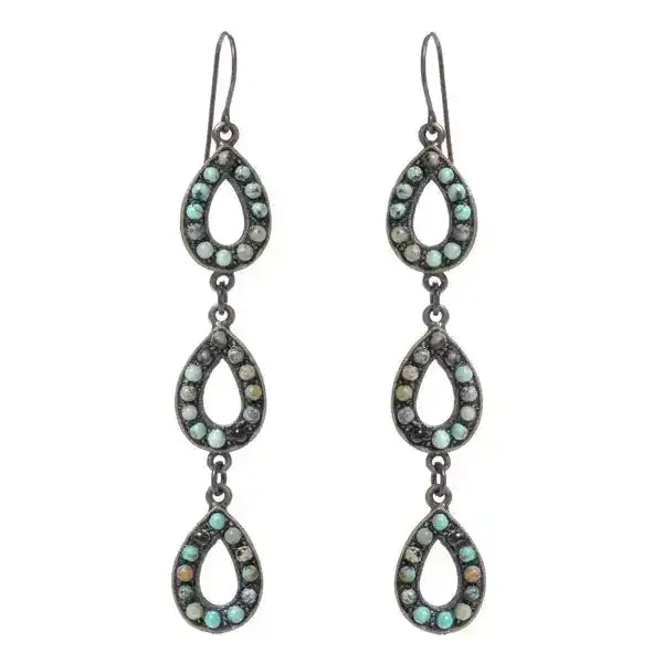 Triple Teardrop Earring $74.00 stone Black Diamond Black Diamond African Turquoise Black Diamond African Turquoise We can't get enough of the triple teardrop earring! So versatile, they look perfect with everything from jeans and a Tee to your fanciest LBD! 2.75" drop Earrings are handmade in NYC. Add to Cart Notify Me When Available
