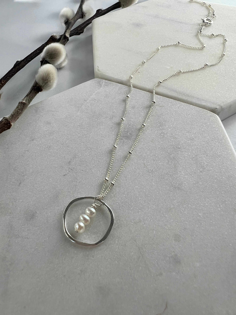 Three tiny white freshwater pearls are surrounded by a hand hammered imperfect circle. A beautiful dotted chain makes this dainty pendant stand out.