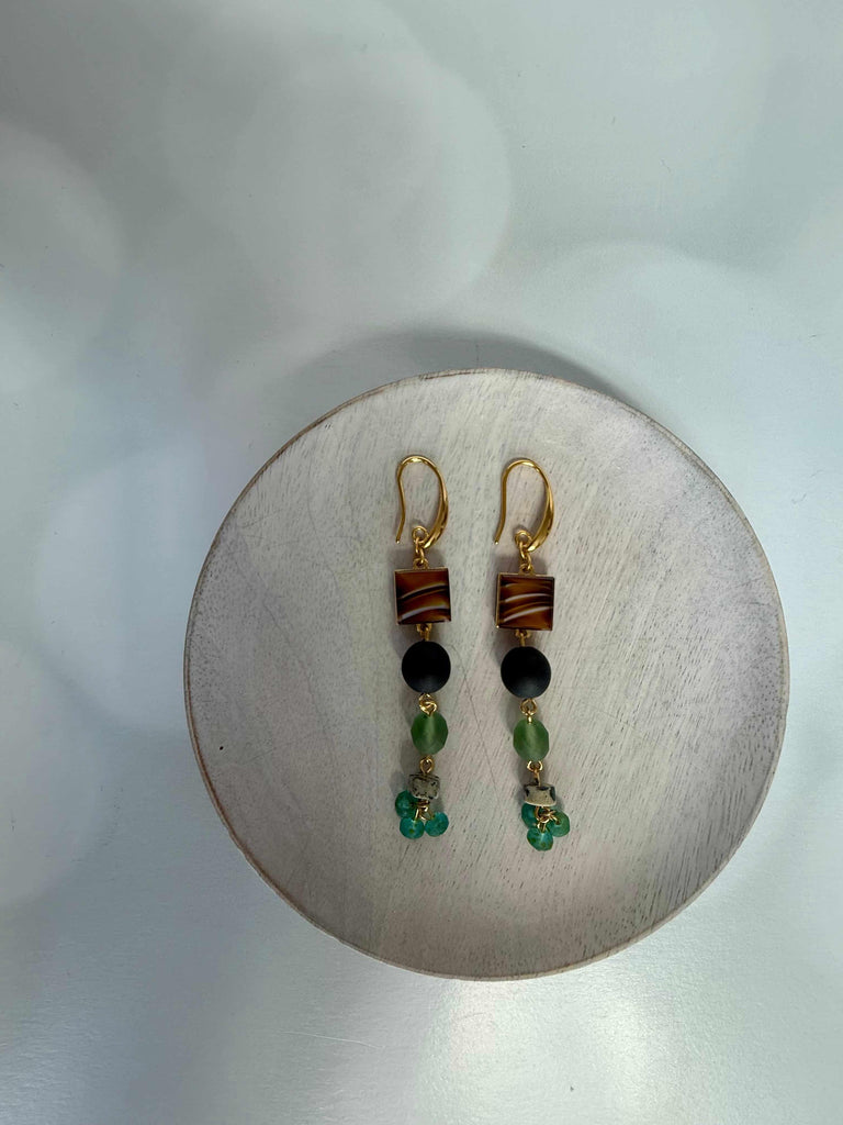 Vintage Glass Earrings $50.00 Default Title Stunning vintage glass earrings! Gold plated brass hook earrings with vintage brown matrix, seafoam, jet, and aqua glass. Each earring measures Earrings are handmade in NJ. Add to Cart Notify Me When Available